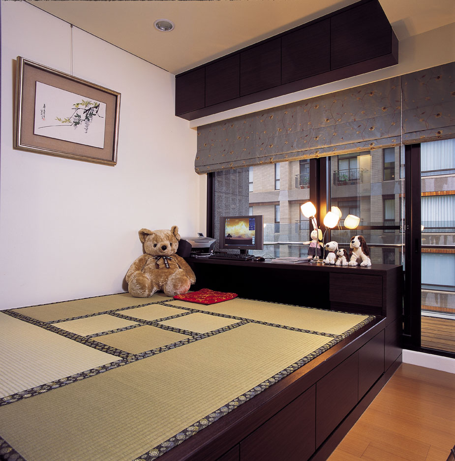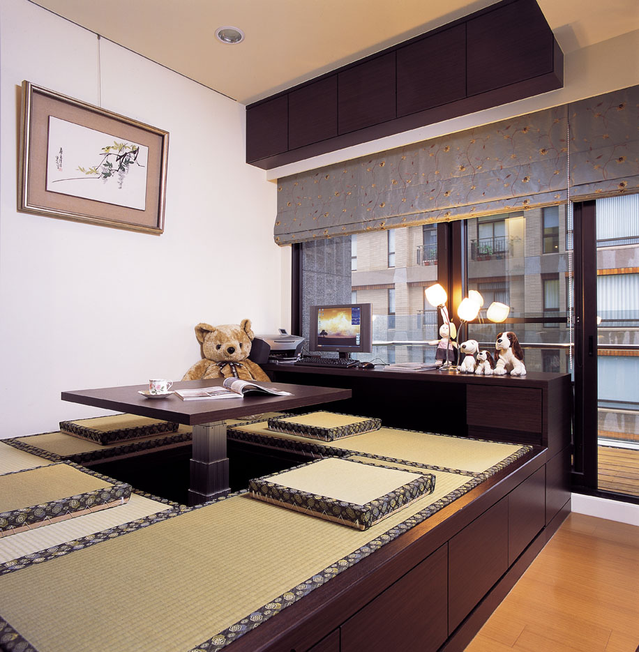 和室空間充滿濃郁的東方禪風,以架高木地板讓空間有更多的利用性,在加高處做為收納空間,兼具實用功能,架高的和室區並設計升降桌,平時可作為休憩空間,或是當成另一個客房使用,朋友來訪時也能於此聊天品茗,享受悠閒的午後時光。