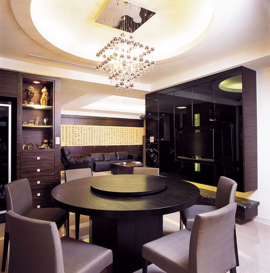 動線來到餐廳區,內崁的圓弧天花板在垂墜式水晶吊燈的點綴下,無形中挑高空間氣勢,成就絕美的視覺焦點。圓弧天花與餐桌上下呼應,象徵團圓的餐敘時光。餐廳與廚房間的門片,同時兼具阻隔油煙、消弭主臥與衛浴對門的風水禁忌。設計師並以名家所繪的荷花畫作融入在拉門之上,與客廳的書法相互呼應,藝術人文的雅致氛圍流洩整室。