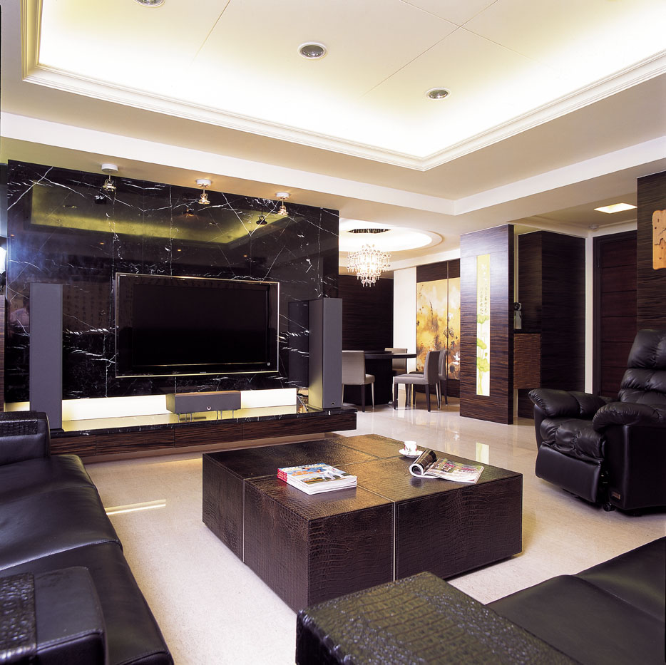 客廳以簡潔的黑雲石大理石主牆,搭配燈光設計、現代而舒適的傢俱,有別於傳統中式傢俱過硬與繁複凝重感,並營造空間大器而豐富的層次感。由於客廳深度過深,沙發背牆刻意以名家揮毫的書法壁布鑲嵌於書櫃門片上,透過文字線條力道形塑出空間的人文氣度,其內規劃書櫃及收納大型行理的空間,並採用進口五金將門板隱於無形,呈現出完整造型的牆面。
