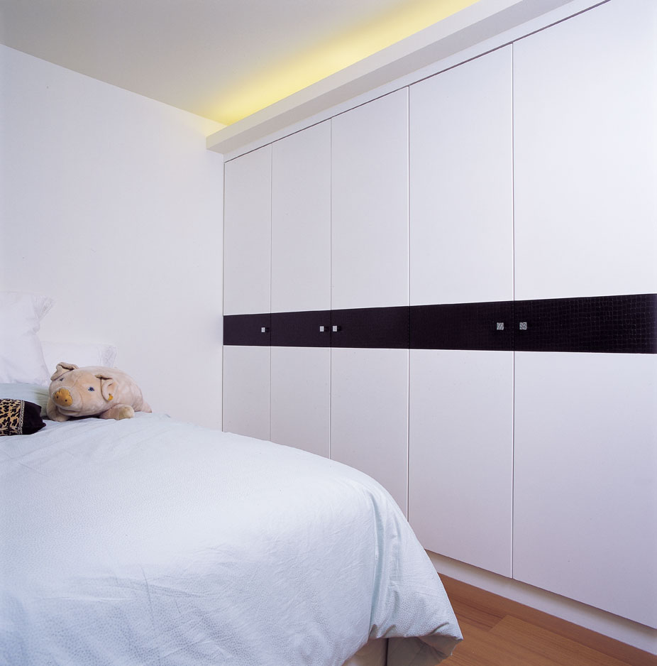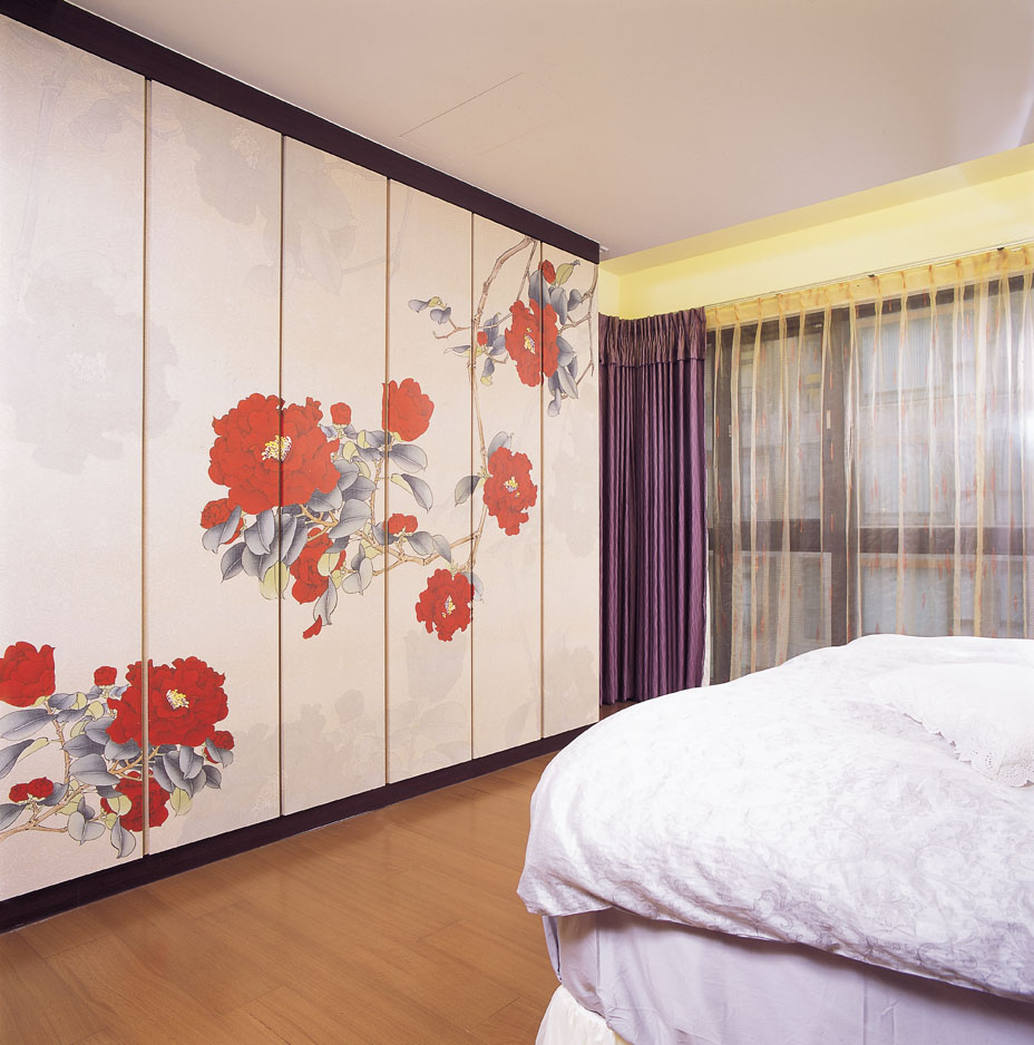 私密的主臥空間,將東方風格融於室內,以沉穩內斂的胡桃木色系傳達靜謐的臥眠氛圍。床前的衣櫃一改制式的木作貼皮,以白色為基底,門面上大膽的山茶花攀繞牆面,栩栩如生的躍然於上。
